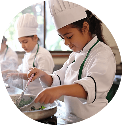 Дети знакомятся с разными кулинарными техниками: безопасной нарезкой, основам работы с тестом, правильным выбором специй и сочетанием ингредиентов.